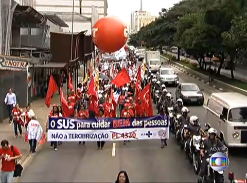 A Central Única dos Trabalhadores (CUT), a União Nacional dos Estudantes (UNE) e o Movimento dos Trabalhadores Rurais Sem Terra (MST), entre outros grupos, realizam nesta terça-feira (7) atos em todo o país contra o projeto de lei que regulamenta os contratos de terceirização no mercado de trabalho.
